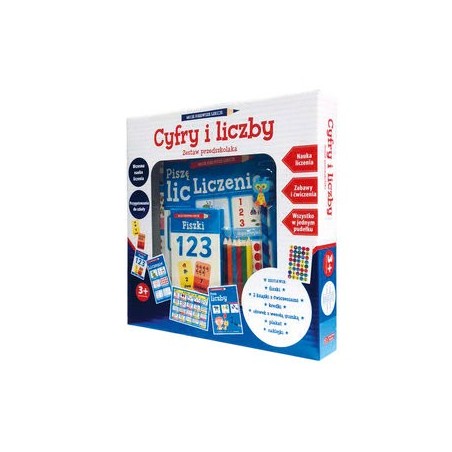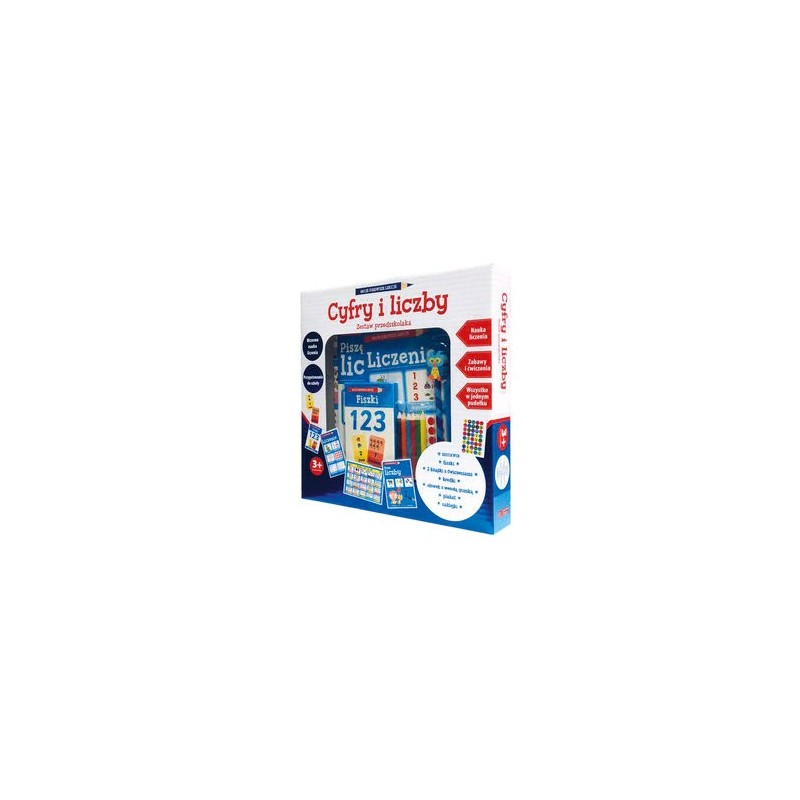 Dwie książki z ćwiczeniami, plakat, naklejki nagrody i zestaw 26 fiszek - wszystko to stworzyliśmy z myślą o dzieciach rozpoczynających swoją przygodę z nauką. Zabawne ilustracje i ciekawe ćwiczenia sprawią, że poznawanie cyfr i liczenie stanie się świetną zabawą. W środku znajdują się też kredki i ołówek z wesołą gumką.