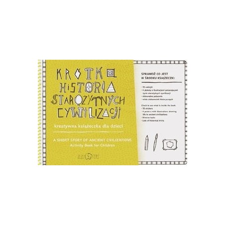 `Krótka Historia Cywilizacji Starożytnych – kreatywna książeczka` proponuje podróż w czasie do świata sprzed tysięcy lat. W środku książeczki znajdują się: 73 naklejki, 4 plakaty w formacie A3 z kartonu z ilustracjami pokazującymi życie starożytnych cywilizacji: Egipt, Rzym, Majowie i Chiny. Różnorodne polecenia: naklejanie, liczenie, wklejanie liter, ćwiczenia na usprawnianie małej motoryki i spostrzegawczości, zadanie kreatywne oraz wiele ciekawostek historycznych