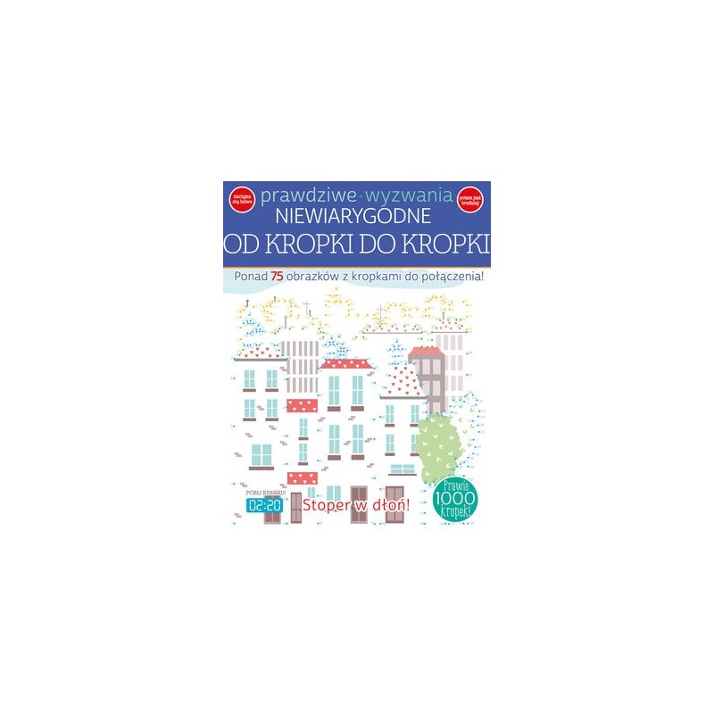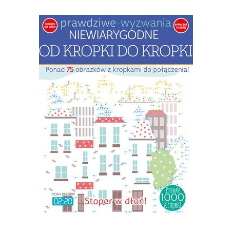 Ponad 75 obrazków z kropkami do połączenia! Obrazki zostały zestawione od najprostszych do bardzo skomplikownych Znajdziesz też takie, które są tak gęste, że będziesz miał ochotę, by zajrzeć do rozwiązania na końcu książki! Możesz też pokolorować niektóre rysunki!