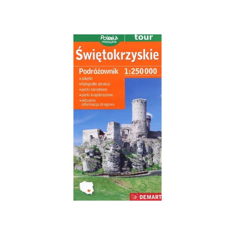 Mapa województwa świętokrzyskiego zawiera informacje przydatne kierowcom i pomaga w wyborze atrakcji turystycznych. Są one bardzo liczne i różnorodne. Obejmują naturę, w tym niespotykane poza wysokimi górami atrakcje geologiczne w skałach niemal wszystkich okresów geologicznych: skałki, gołoborza, jaskinie i groty, odsłonięcia, nieczynne kamieniołomy i kopalnie, ponadto piękne krajobrazy Gór Świętokrzyskich z Puszczą Jodłową chronioną w Świętokrzyskim PN oraz inne przepiękne krajobrazy wyżynne i lasy znajdujące się w aż 9(!) parkach krajobrazowych. O dawnym znaczeniu tych ziem świadczą zamki strzegące polsko-śląskiego pogranicza, stare kościoły i klasztory. Dzieje miast takich jak Sandomierz, Bodzentyn, Chęciny i Iłża pokazują, że kluczowe niegdyś ośrodki władzy mogą zostać zmarginalizowane. A pozostałości najstarszego na ziemiach polskich okręgu przemysłowego – Staropolskiego – rozbudzą wyobraźnię niejednego miłośnika techniki i militariów. O atrakcjach turystycznych na mapie informują specjalne znaki oraz bardzo zwięzłe opisy, natomiast na odwrocie znajdują się fotografie wybranych obiektów i nieco bardziej rozbudowane teksty. Najwięcej uwagi poświęcono parkom – narodowemu (ma oddzielną mapę) i krajobrazowym W województwie świętokrzyskim na pewno każdy znajdzie coś dla siebie. - zabytki - fotografie atrakcji - parki narodowe i krajobrazowe - imprezy cykliczne - aktualne informacje drogowe.