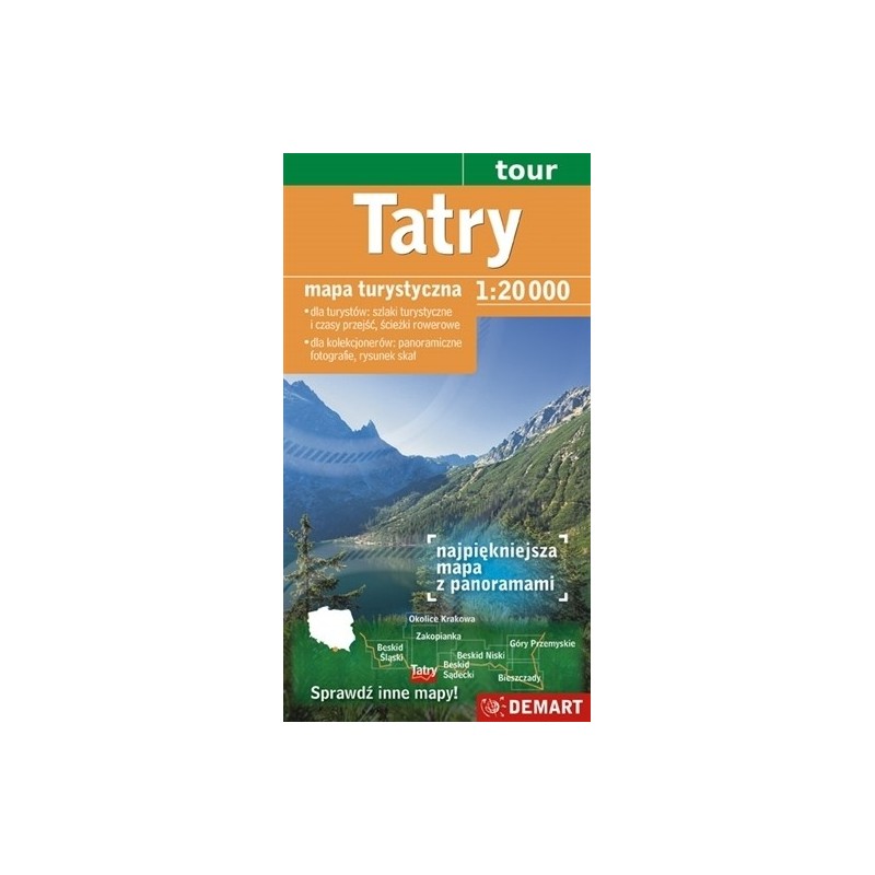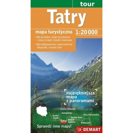 Dwustronna mapa turystyczna Tatr swoim zasięgiem obejmuje Tatry Zachodnie i Tatry Wysokie. Opracowano ją w szczegółowej skali 1 : 20 000. Przedstawia szlaki turystyczne wraz z czasem przejścia, ścieżki dydaktyczne, trasy rowerowe i dzięki temu jest niezastąpiona dla turystów pieszych i rowerzystów planujących górskie wycieczki. Lokalizacja wyciągów narciarskich, nartostrad i tras zjazdowych stanowi niezbędną informację dla miłośników białego szaleństwa. Szczegółowy rysunek skał i cieniowanie oddają bardzo plastycznie rzeźbę terenu tego pięknego regionu. Wspaniały efekt potęguje 11 panoram fotograficznych z podpisanymi szczytami, przełęczami, dolinami oraz stawami. Całości dopełnia słownik krajoznawczy z charakterystyką całych Tatr oraz najważniejszych obiektów fizjograficznych. Uwzględniono: szczyty, przełęcze, doliny, stawy, rzeki, wodospady oraz szlaki, miejscowości i podstawowe informacje praktyczne.