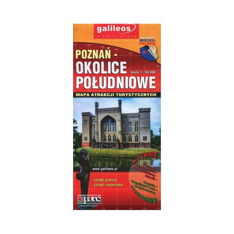 Mapa południowych okolic Poznania 1 : 50 000 Plany - skala 1:12 500 (centrum Poznania), 1:11 000 (Giecz, Rogalin), 1:10 000 (Kórnik), 1:7 500 (Środa Wielkopolska) Aktualizowana w terenie mapa turystyczna południowych okolic Poznania z zaznaczonymi szlakami pieszymi i rowerowymi. Na rewersie znajduje się bogaty opis turystyczny wraz ze zdjęciami najważniejszych atrakcji wchodzących w skład obszaru mapy. Dodatkowo umieszczono dokładne plany centralnej części: Poznania, Środy Wielkopolskiej, Kórnika, Rogalina i Giecza