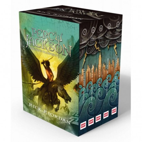 Pięć tomów bestsellerowej serii Percy Jackson i Bogowie Olimpijscy w specjalnie zaprojektowanym pudełku.