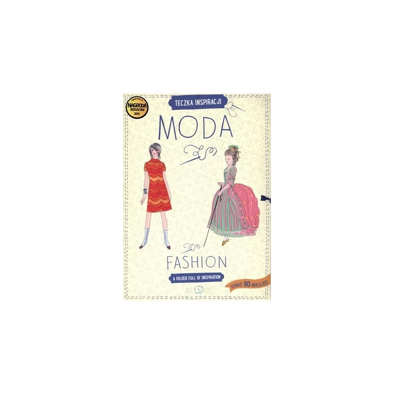 Co zawiera teczka: 15 kart ze strojami charakterystycznymi dla danej epoki Książeczka w formie wachlarza – 15 historii ubrań 91 naklejek z dodatkami do strojów Po drugiej stronie każdej karty – wzór tkaniny lub biżuteria z epoki do pokolorowania 15 nazwisk ikon mody