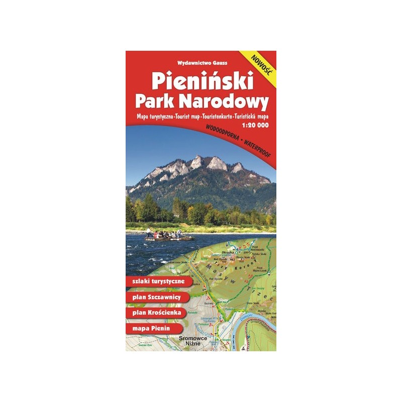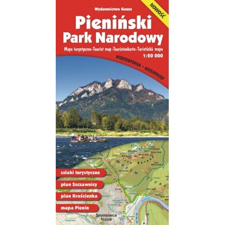 Mapa turystyczna Pienińskiego Parku Narodowego, w wersji wodoodpornej, w najdokładniejszej na rynku skali 1:20 000. Zawiera bogatą treść turystyczną: • szlaki piesze z czasami przejść, drogowskazy na szlakach, szlaki rowerowe • przystanie flisackie, punkty informacji turystycznych parku narodowego • zabytki, muzea, kościoły • koleje linowe, wyciągi narciarskie • schroniska górskie i młodzieżowe, kempingi, pola namiotowe • parkingi, przystanki autobusowe, postoje dorożek Na odwrocie mapy umieszczono plany Szczawnicy i Krościenka nad Dunajcem w skali 1:10 000 oraz mapę całego pasma Pienin w skali 1: 70 000. Legenda opracowana jest w języku polskim, angielskim, niemieckim i słowackim.