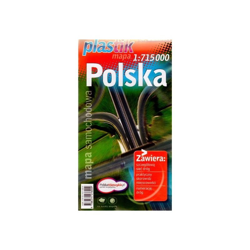 Mapa samochodowa Polski w skali 1:715 000. Cała mapa jest laminowana, wytrzymała i wygodna w użyciu. Łatwo się rozkłada i składa, a pokrycie mapy folią laminowaną pozwala zaznaczać drogę na mapie, robić notatki. Mapa jest mocna, nie zniszczy i nie porwie się tak szybko jak wersja papierowa. Zawiera szczegółową sieć dróg, praktyczny skorowidz miejscowości oraz numerację dróg.