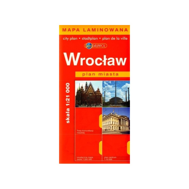 Mapa laminowana. Wrocław. Plan miasta w skali 1:21 000. Trasy komunikacji miejskiej, turystyczna mapa okolic 1:200 000, plan centrum 1: 10 000. Na mapie zaznaczono europejskie i krajowe numery dróg, koleje ze stacjami, linie autobusowe, linie tramwajowe, zabudowę mieszkaniową, numery domów, tereny przemysłowo magazynowe, ważniejsze obiekty zabytkowe, lasy, parki, cmentarze, , kościoły, cerkwie, synagogi, zamki, pomniki, muzea, teatry, kina galerie, szpitale, pogotowie ratunkowe, policję, poczty, konsulaty, hotele, schroniska młodzieżowe, campingi, parkingi, lotniska, przystanki PKS, trasy rowerowe.