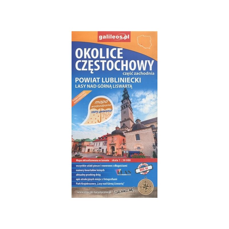 Mapa obejmuje swym zasięgiem obejmuje zachodnie okolice Częstochowy, a w nich Park Krajobrazowy Górnej Liswarty, powiat lubliniecki, zawiera sieć dróg z numeracją, granice gmin oraz bogatą treść turystyczną: szlaki piesze i rowerowe, ścieżki przyrodnicze, zabytki, ciekawe miejsca i przyrodniczą - granice rezerwatów, pomniki przyrody . Zawiera nazwy ulic w miejscowościach.
