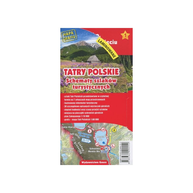 Zdobycie Giewontu, wycieczka nad Morskie Oko czy podziwianie dywanu krokusów w Dolinie Chochołowskiej? Z zestawem map „Tatry Polskie. Schematy szlaków turystycznych” w wersji laminowanej bez trudu zaplanujesz wycieczkę do tych oraz innych miejsc dostępnych do zwiedzania w Tatrach. Zestaw siedmiu map przedstawia regiony Tatrzańskiego Parku Narodowego oraz Gubałówkę. Przestrzenne ukazanie terenu oraz czytelnie oznaczone szlaki z informacją o stopniu trudności i czasem przejść sprawiają, że ta pozycja skierowana jest do każdego odbiorcy. W wyborze wycieczek oraz ich logistycznym przygotowaniu bezcennym może się okazać ilustrowany informator opisujący poszczególne rejony, 30 tras wycieczkowych oraz sposoby dojazdu do ich miejsc startowych. W części opisowej pozostawiono miejsca na pamiątkowe pieczątki, które można przybić w recepcjach schronisk górskich i w innych miejscach, np. Sanktuarium Maryjne na Wiktorówkach czy na stacji kolejki linowej na Kasprowym Wierchu. Na odwrocie arkusza nr 6 „Gubałówka” znajduje się mapa Zakopanego w skali 1:16 000. Ponadto do zestawu dołączona jest gratisowa mapa Tatr Polskich w skali 1:60 000. Wykaz arkuszy (ujętych w kartonowym etui): 1. Morskie Oko, Rysy i Dolina Pięciu Stawów Polskich 2. Kasprowy Wierch, Dolina Gąsienicowa i Orla Perć 3. Regle Tatr Wysokich 4. Giewont, Czerwone Wierchy i regle Tatr Zachodnich 5. Dolina Kościeliska 6. Dolina Chochołowska 7. Gubałówka 8. Mapa gratis – Tatry Polskie 1:60 000