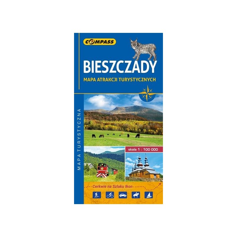 Mapa Bieszczad w skali 1:100`000 zawiera całość tego rozległego masywu - od Komańczy na zachodzie po granicę z Ukrainą na wschodzie oraz od Birczy na północy po Przełęcz Użocką. Znaleźć na niej można wszystkie atrakcje turystyczne tego niezmiernie ciekawego regionu: przyrodnicze, historyczne czy sportowo-rekreacyjne. Opis kilkudziesięciu - naszym zdaniem - największych atrakcji został umieszczony na odwrocie mapy, a sama mapa wzbogacona o kolorowe ikony.