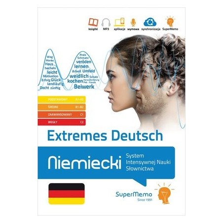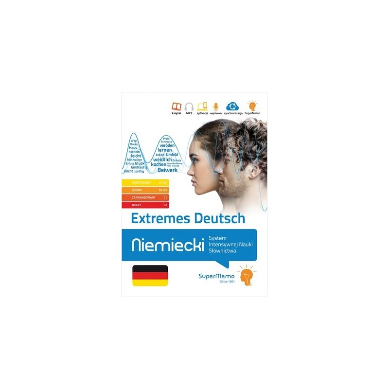 Poznaj ponad 25 tysięcy najważniejszych słów niemieckich na poziomie podstawowym i średnim (A1-B2) oraz zaawansowanym i biegłym (C1-C2) i zapamiętaj je na zawsze dzięki metodzie inteligentnych powtórek SuperMemo! Extremes Deutsch. Niemiecki. System Intensywnej Nauki Słownictwa zapewni Ci najlepsze wsparcie w intensywnej i skutecznej nauce: kiedy przygotowujesz się do egzaminów językowych, takich jak matura lub Goethe-Zertifikat, albo szlifujesz ogólną znajomość języka. Do Twojej dyspozycji oddajemy zawierające łącznie 448 stron podręczniki, obejmujące kluczowe słownictwo ze znacznie obszerniejszych multimedialnych wersji kursów, podzielone na 12 kategorii tematycznych, z tłumaczeniami i przykładami użycia. Tematy przewodnie w podręczniku i kursach multimedialnych: 1. Körper, Leben und Lebewesen – Ciało, życie i istoty żywe 2. Menschen und Familie – Ludzie i rodzina 3. Gebäude, Zuhause, Kleidung und persönliche Pflege – Budowle, dom, odzież i higiena osobista 4. Gefühle, Emotionen, Einstellungen und Empfindungen – Uczucia, emocje, postawy i odczucia 5. Gedanken und Kommunikation – Myśl, komunikacja i język 6. Stoffe, Gegenstände und Ausstattung – Substancje, przedmioty i wyposażenie 7. Kunst, Industrie, Bildung und Technologie – Sztuka, przemysł, edukacja i technologia 8. Zahlen, Maße, Geld und Handel – Liczby, miary, pieniądze i handel 9. Unterhaltung, Spiele und Sport – Rozrywka, gry i sport 10. Aussehen, Raum und Zeit – Wygląd, czas i przestrzeń 11. Bewegung, Lage, Reisen und Transport – Ruch, położenie, podróżowanie i transport 12. Allgemeine und abstrakte Begriffe – Pojęcia ogólne i abstrakcyjne Kupując książki, otrzymujesz kod dostępu do ich rozszerzeń multimedialnych w SuperMemo.com: nagrań MP3 oraz ćwiczeń wspieranych oryginalną metodą inteligentnych powtórek SuperMemo, w serwisie i aplikacji SuperMemo. Jednocześnie zwracamy uwagę, że zawartość podręczników może odbiegać od materiału kursów w SuperMemo.com – w kursach mogą wystąpić dodatkowe/inne zadania lub ćwiczenia, których nie ma w książkach. Niezbędne wymagania dotyczące korzystania z dodatków multimedialnych znajdują na stronie SuperMemo.apps. SuperMemo.com to między innymi: - indywidualny dostęp do platformy internetowej i aplikacji (Windows, Android, iOS), online i offline - synchronizacja postępów nauki między Twoimi urządzeniami - nagrania MP3 - funkcja rozpoznawania mowy, która wspiera naukę wymowy - oparta o badania naukowe, wielokrotnie nagradzana metoda SuperMemo, pozwalająca zapamiętywać tysiące słów z blisko 100% skutecznością.