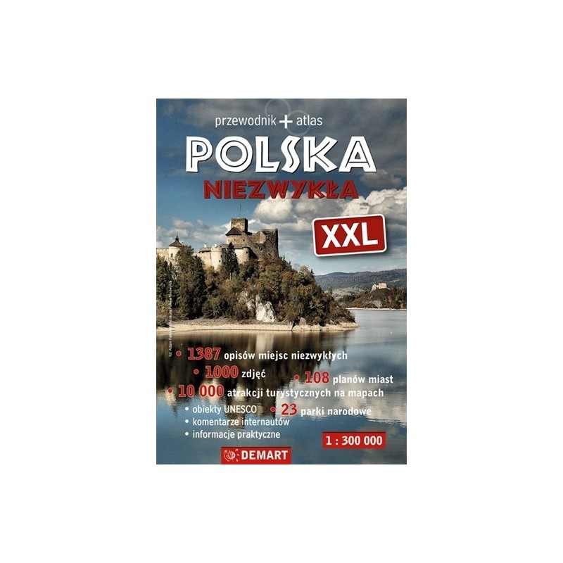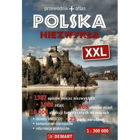 POLSKA NIEZWYKŁA XXL to połączenie praktycznego przewodnika z atlasem i informatorem. Dodatkowo zawiera informacje o imprezach cyklicznych oraz wykaz największych atrakcji Polski ilustrowany efektownymi mapami w kilku kategoriach: Zamki i pałace, Świątynie, Przemysł i technika, Militaria, Kultura ludowa, Zespoły urbanistyczne i zespoły zabytków, Przyroda, Imprezy, Rekordy. POLSKA NIEZWYKŁA XXL to: – ponad 51 000 miejscowości na mapie turystyczno-samochodowej – 10 000 atrakcji turystycznych zaznaczonych bezpośrednio na mapach – 1387 opisów miejsc niezwykłych – ponad 1000 fotografii – 108 planów miast – 70 rozdziałów części przewodnikowej – 9 rozdziałów kompendium wiedzy o najważniejszych atrakcjach turystycznych – opisy i mapy wszystkich 23 parków narodowych – opisy wszystkich polskich obiektów znajdujących się na Liście Światowego Dziedzictwa UNESCO – wykaz ponad 1300 imprez cyklicznych – informator adresowy obejmujący prawie 1200 muzeów i 500 punktów informacji turystycznej