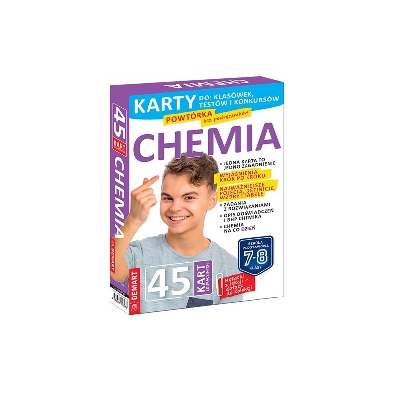 Karty edukacyjne z chemii zawierają wszystkie tematy omawiane w klasach VII-VIII w szkole podstawowej uwzględnione w podstawie programowej. 45 dwustronnych, kolorowych, starannie graficznie opracowanych kart zastępuje podręczniki z dwóch klas. Jedna karta prezentuje jeden temat. Format kart jest nieprzypadkowy – mają się zmieścić w zeszycie i być „ściągawką” wyjaśniającą i podsumowującą prezentowane zagadnienie krok po kroku. Wiele zagadnień wyjaśniają poglądowe wzory strukturalne, schematy, rysunki i zdjęcia. Są też opisy doświadczeń i przykłady z życia codziennego. Wiedza teoretyczna, czyli zróżnicowanie pierwiastków, reakcje i procesy chemiczne oraz definicje są punktem wyjścia do wyjaśnienia „krok po kroku” jak należy je stosować w zadaniach na konkretnych przykładach. Na każdej karcie znajdują się też zadania do samodzielnego wykonania przez ucznia. Są zróżnicowane i oprócz ułożenia wzoru reakcji i wyliczeń liczbowych obejmują też polecenia sprawdzające rozumienie procesów, a odpowiedzi do nich są specjalnie opisane „do góry nogami`. Chodzi o to, żeby uczeń najpierw sam spróbował je wykonać i dopiero potem weryfikował swoje rozumowanie. To znakomita pomoc, którą uczniowie mogą wykorzystywać samodzielnie, a także z udziałem dorosłych.